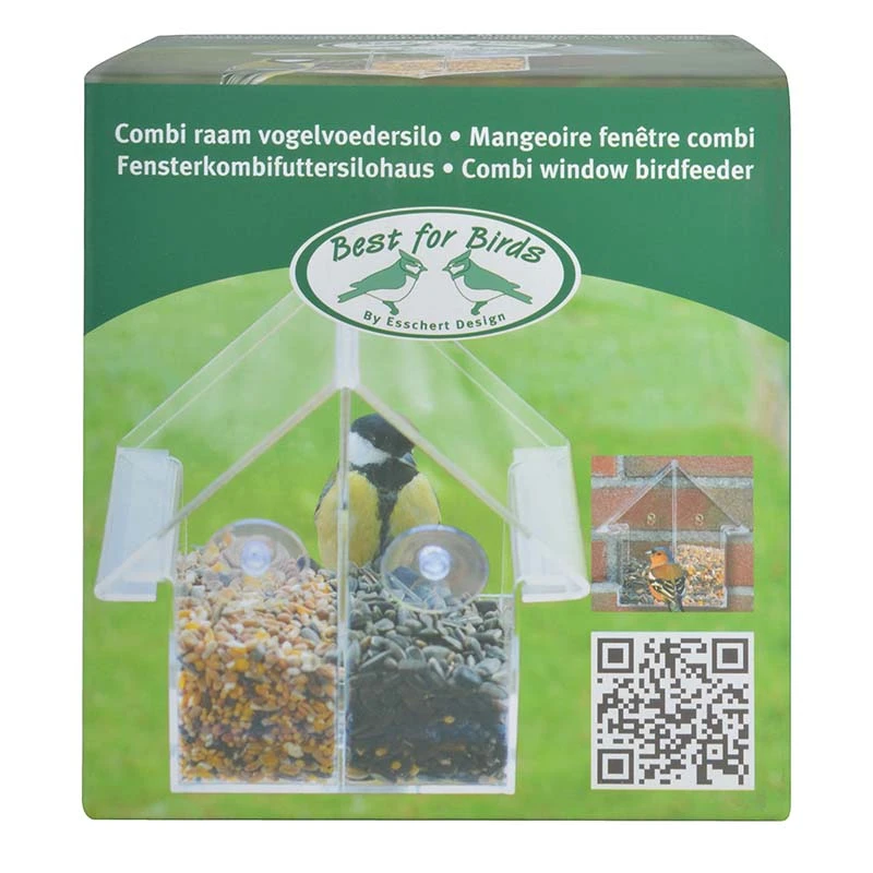 Deze moderne en functionele combi raamsilo heeft verschillende praktische eigenschappen. Het voederhuis wordt met de bijgeleverde twee zuignappen op het raam geplaatst. Dankzij het doorzichtig materiaal is het mogelijk om van binnen te observeren hoe de vogels genieten van hun eten . Daarnaast is het makkelijk te constateren wanneer het combivoedersilo bijgevuld moet worden. Het bijvullen gaat heel simpel, door het naar voren schuiven van het dak. Het voergedeelte is opgesplitst in twee separate vakken, die met verschillende soorten vogelvoer gevuld kunnen worden. De verhoogde rand dient als zitmogelijkheid voor de vogels, hierdoor ontstaat een gescheiden voerbak. De vogels komen niet in het voer te zitten, waardoor ziektes voorkomen worden.