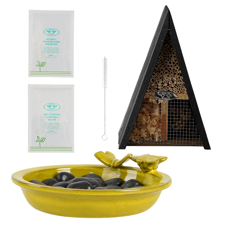 Deze set bevat een vlinder- en bijen drink/eetplek plek, een zak bloemenzaden speciaal voor vlinders en een praktisch insectenhotel. Door de structuur van het hotel kunnen insecten zich vrij nestelen en hun pootjes laten rusten.