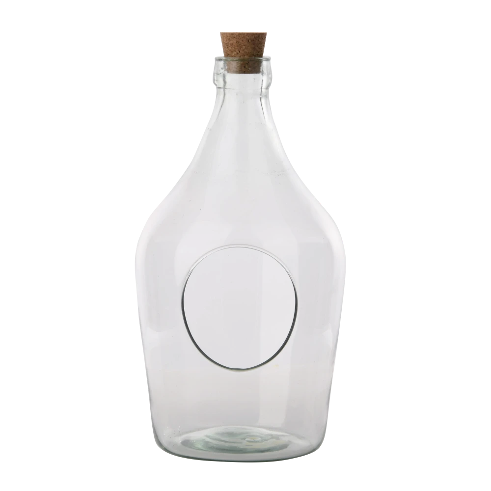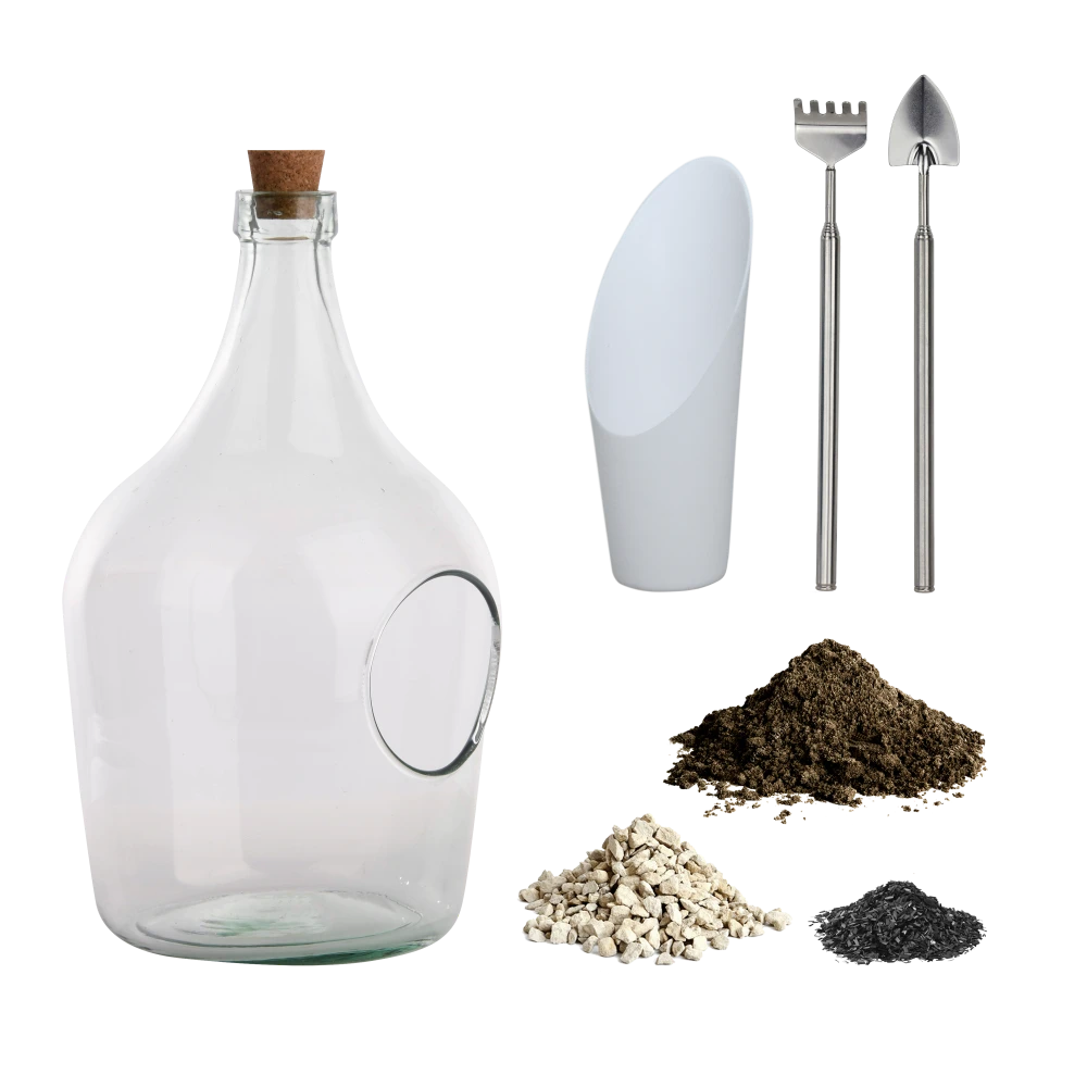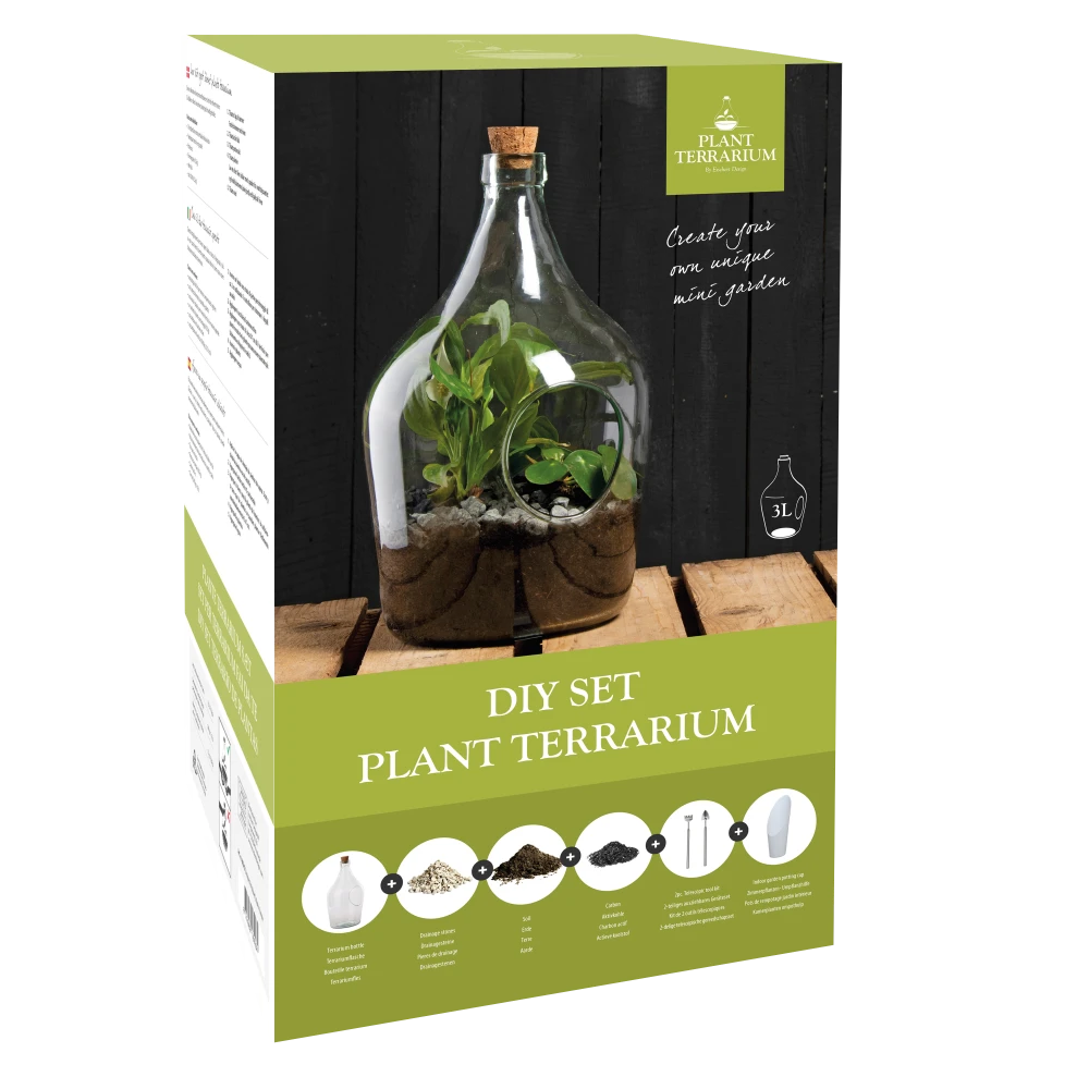 Deze decoratieve open terrarium fles is een aanwinst in ieder interieur. Doordat de fles open is, zijn de plantjes gemakkelijk te verzorgen en kan iedere plantensoort worden gebruikt. De set bestaat uit een 3 liter terrariumfles, een ompothulp, potgrond, koolstof, drainagestenen en een gereedschapset.