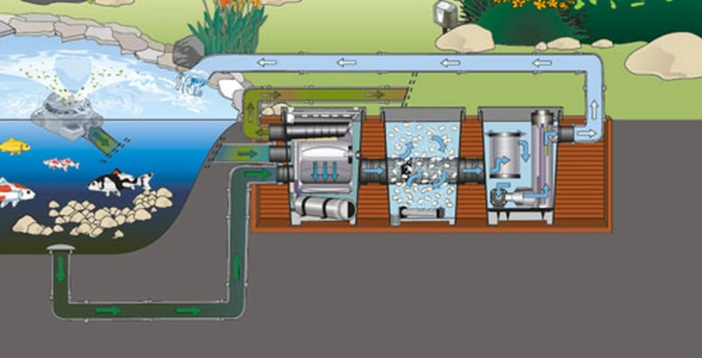 Dit betreft de gravity gevoede versie, dit betekend dat deze gedeeltelijk onder water niveau geplaatst word. Door dat pomp achter het systeem staat, kan er een energie zuiniger vijverpomp toegepast worden.