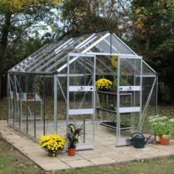 De Blockley hobbykas biedt veel ruimte voor de startende maar ook gevorderde hobbytuinder. Deze vrijstaande kas wordt standaard uitgevoerd met een drempelloze dubbele schuifdeur met slot. De dubbele schuifdeur is 120cm breed en heeft een hoogte van maar liefst 200cm. Voor de extra brede goot met een breedte van 80mm worden gratis 2 regenpijpen met een diameter van 40mm meegeleverd. De Blockley kas biedt keuze uit 2 soorten afdichting: 3 mm dik veiligheidsglas of 6 mm polycarbonaat. De afdichting wordt gefixeerd met kunststof beglazingsstrips. De voordelen per type afdichting op rij: Veiligheidsglas: geleverd in lange ruiten en tot 6 keer sterker dan tuindersglas. Polycarbonaat (dubbelwandig): licht van gewicht, onbreekbaar en heeft een beter isolerende werking dan glas. Het frame van de Blockley is standaard leverbaar in een blanke uitvoering. Voor een meer luxueuze uitstraling en / of eenheid met de omgeving waarin de kas wordt geplaatst, is deze kas leverbaar in een zwarte of klassiek donkergroen gecoate uitvoering. Een goede beluchting is van levensbelang in de kas. Daarom is de Blockley voorzien van 4 dakramen in alle modellen. Voor optimaal gebruiksgemak wordt het gebruik van een automatische raamopener geadviseerd. Deze raamopeners zijn temperatuurgevoelig en openen of sluiten het dakraam automatisch. Voor een stabiele en sterke basis is een funderingsrand noodzakelijk. De Blockley wordt standaard (gratis) geleverd met een aluminium funderingsrand van 8cm hoog. Indien u kiest voor een zwart of donkergroen gecoate kas wordt ook de fundering in deze kleur meegeleverd.Â