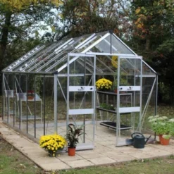 De Blockley hobbykas biedt veel ruimte voor de startende maar ook gevorderde hobbytuinder. Deze vrijstaande kas wordt standaard uitgevoerd met een drempelloze dubbele schuifdeur met slot. De dubbele schuifdeur is 120cm breed en heeft een hoogte van maar liefst 200cm. Voor de extra brede goot met een breedte van 80mm worden gratis 2 regenpijpen met een diameter van 40mm meegeleverd. De Blockley kas biedt keuze uit 2 soorten afdichting: 3 mm dik veiligheidsglas of 6 mm polycarbonaat. De afdichting wordt gefixeerd met kunststof beglazingsstrips. De voordelen per type afdichting op rij: Veiligheidsglas: geleverd in lange ruiten en tot 6 keer sterker dan tuindersglas. Polycarbonaat (dubbelwandig): licht van gewicht, onbreekbaar en heeft een beter isolerende werking dan glas. Het frame van de Blockley is standaard leverbaar in een blanke uitvoering. Voor een meer luxueuze uitstraling en / of eenheid met de omgeving waarin de kas wordt geplaatst, is deze kas leverbaar in een zwarte of klassiek donkergroen gecoate uitvoering. Een goede beluchting is van levensbelang in de kas. Daarom is de Blockley voorzien van 4 dakramen in alle modellen. Voor optimaal gebruiksgemak wordt het gebruik van een automatische raamopener geadviseerd. Deze raamopeners zijn temperatuurgevoelig en openen of sluiten het dakraam automatisch. Voor een stabiele en sterke basis is een funderingsrand noodzakelijk. De Blockley wordt standaard (gratis) geleverd met een aluminium funderingsrand van 8cm hoog. Indien u kiest voor een zwart of donkergroen gecoate kas wordt ook de fundering in deze kleur meegeleverd.