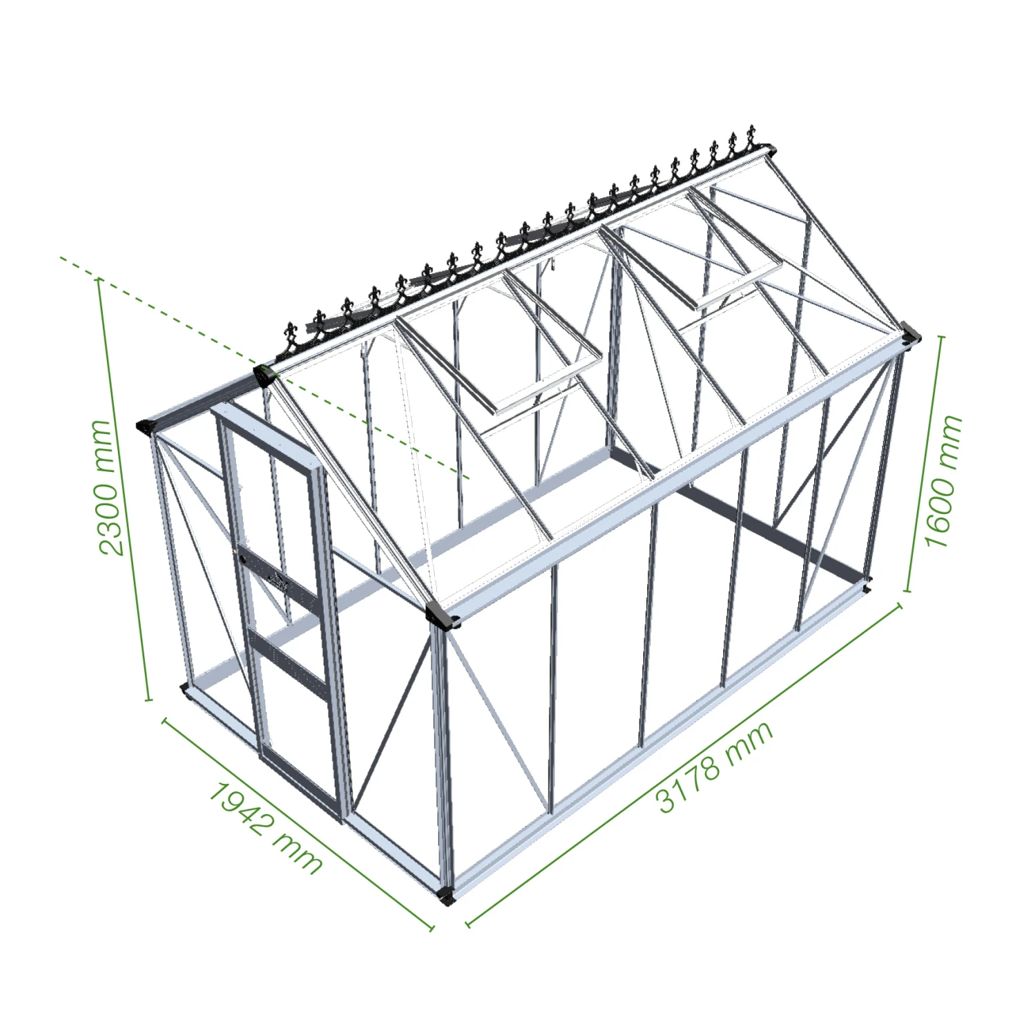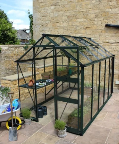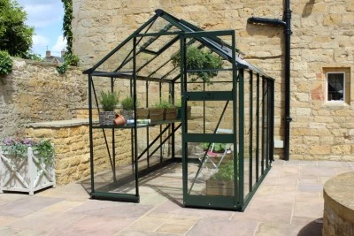 Zoekt u een ranke tuinkas met een flinke stahoogte? Kies dan voor de Burford. Deze vrijstaande kas wordt standaard uitgevoerd met een drempelloze enkele schuifdeur met slot. De schuifdeur is 65cm breed en heeft een hoogte van maar liefst 200cm. U gaat dus niet gebukt de kas in! Voor de extra brede goot met een breedte van 80mm worden gratis 2 regenpijpen met een diameter van 40mm meegeleverd. De Burford kas biedt keuze uit 2 soorten afdichting: 3 mm dik veiligheidsglas of 6 mm polycarbonaat. De afdichting wordt gefixeerd met kunststof beglazingsstrips. De voordelen per type afdichting op rij: Veiligheidsglas: geleverd in lange ruiten en tot 6 keer sterker dan tuindersglas. Polycarbonaat (dubbelwandig): licht van gewicht, onbreekbaar en heeft een beter isolerende werking dan glas. Het frame van de Burford is standaard leverbaar in een blanke uitvoering. Voor een meer luxueuze uitstraling en / of eenheid met de omgeving waarin de kas wordt geplaats is deze kas leverbaar in een zwarte of klassiek donkergroen gecoate uitvoering. Een goede beluchting is van levensbelang in de kas. Daarom is de Burford voorzien van 2 dakramen in model 66 + 86 en 4 dakramen in het grootste model; 106. Voor optimaal gebruiksgemak wordt het gebruik van een automatische raamopener geadviseerd. Deze raamopeners zijn temperatuurgevoelig en openen of sluiten het dakraam automatisch. Voor een stabiele en sterke basis is een funderingsrand noodzakelijk. De Burford wordt standaard (gratis) geleverd met een aluminium funderingsrand van 8cm hoog. Indien u kiest voor een zwart of donkergroen gecoate kas wordt ook de fundering in deze kleur meegeleverd.