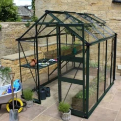Zoekt u een ranke tuinkas met een flinke stahoogte? Kies dan voor de Burford. Deze vrijstaande kas wordt standaard uitgevoerd met een drempelloze enkele schuifdeur met slot. De schuifdeur is 65cm breed en heeft een hoogte van maar liefst 200cm. U gaat dus niet gebukt de kas in! Voor de extra brede goot met een breedte van 80mm worden gratis 2 regenpijpen met een diameter van 40mm meegeleverd. De Burford kas biedt keuze uit 2 soorten afdichting: 3 mm dik veiligheidsglas of 6 mm polycarbonaat. De afdichting wordt gefixeerd met kunststof beglazingsstrips. De voordelen per type afdichting op rij: Veiligheidsglas: geleverd in lange ruiten en tot 6 keer sterker dan tuindersglas. Polycarbonaat (dubbelwandig): licht van gewicht, onbreekbaar en heeft een beter isolerende werking dan glas. Het frame van de Burford is standaard leverbaar in een blanke uitvoering. Voor een meer luxueuze uitstraling en / of eenheid met de omgeving waarin de kas wordt geplaats is deze kas leverbaar in een zwarte of klassiek donkergroen gecoate uitvoering. Een goede beluchting is van levensbelang in de kas. Daarom is de Burford voorzien van 2 dakramen in model 66 + 86 en 4 dakramen in het grootste model; 106. Voor optimaal gebruiksgemak wordt het gebruik van een automatische raamopener  geadviseerd. Deze raamopeners zijn temperatuurgevoelig en openen of sluiten het dakraam automatisch. Voor een stabiele en sterke basis is een funderingsrand noodzakelijk. De Burford wordt standaard (gratis) geleverd met een aluminium funderingsrand van 8cm hoog. Indien u kiest voor een zwart of donkergroen gecoate kas wordt ook de fundering in deze kleur meegeleverd.Â