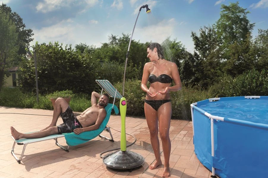 Met de knop aan de stang kan zo de perfecte temperatuur voor een heerlijke douche worden geregeld. Het gevulde waterreservoir verwarmt tot 60°C en kan, wanneer goed gemixt met koud water via een aangesloten tuinslang, zorgen voor 60 liter water van 30°C.