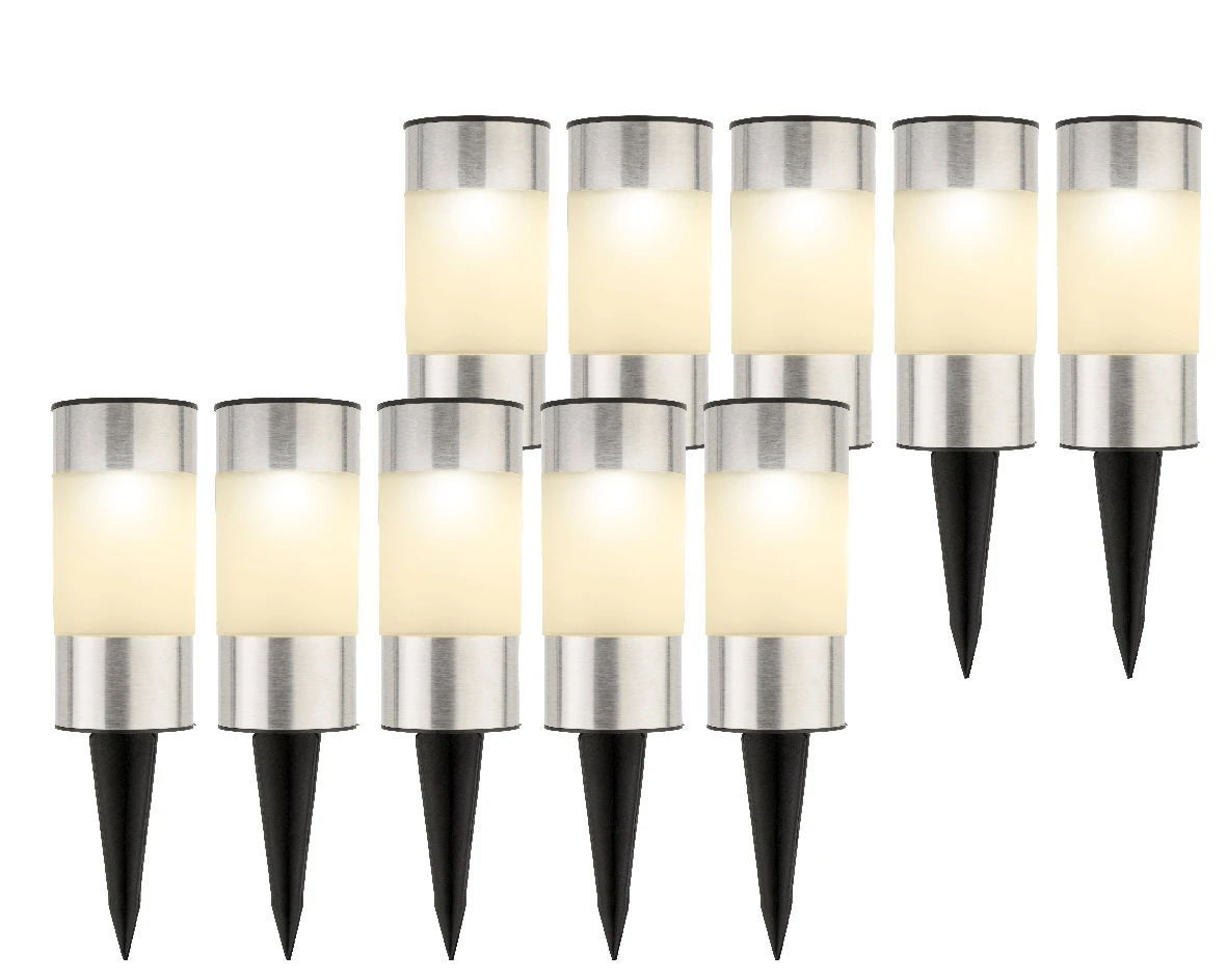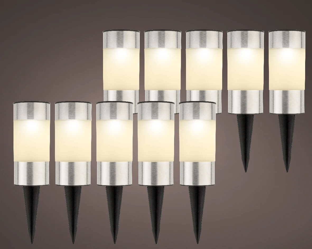 Deze solar staande tuinlampen werken met een zonnepaneel. Deze set bestaat uit een 10 tal tuinlampen met ieder een solar paneel.