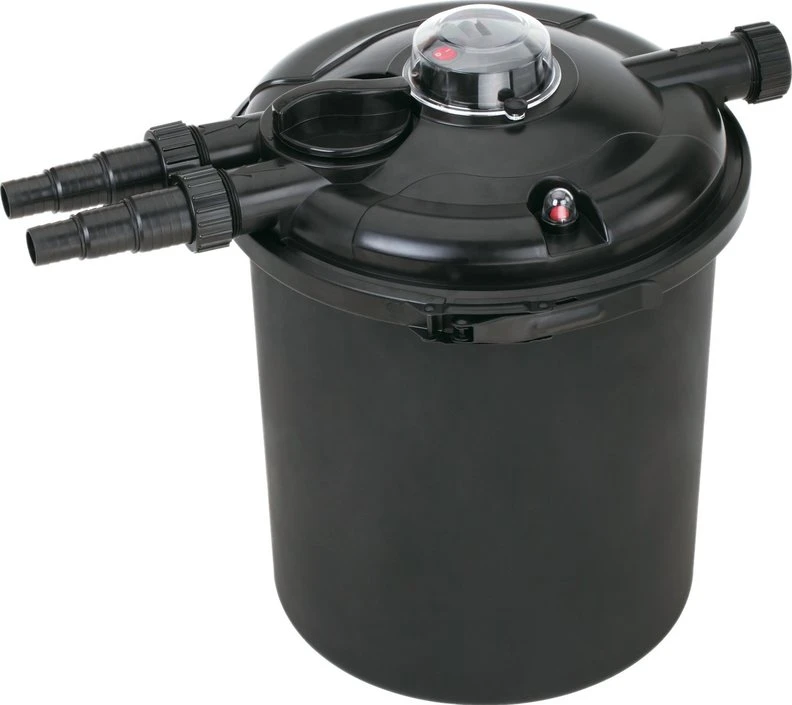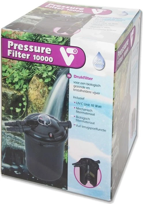 De VT Drukfilter Pressure Filter 10000 helpt u bij het onderhouden van uw vijver. De drukfilter zorgt ervoor dat het water het hele jaar schoon blijft. Het filter wordt aangesloten op de pomp van de vijver. Deze pompt het water in het filter, waarna het zuiver proces begint. Het water wordt door drie fasen gereinigd. Dit gaat om de volgende manier: