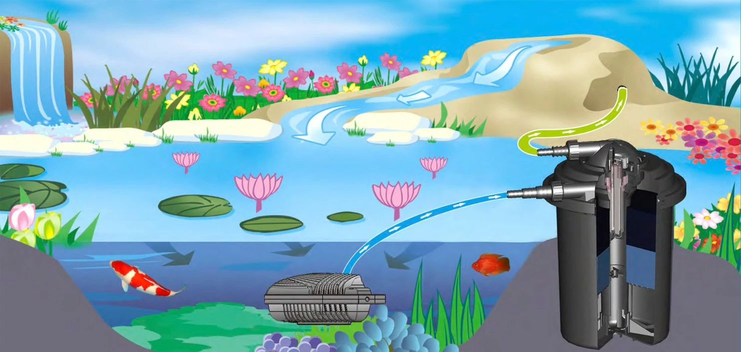 - De derde fase bestaat uit een UV-C behandeling. Het water stroomt langs het UV-C licht en doodt zweefalgen en ziektekiemen. Het resultaat is helder en gezond vijverwater.